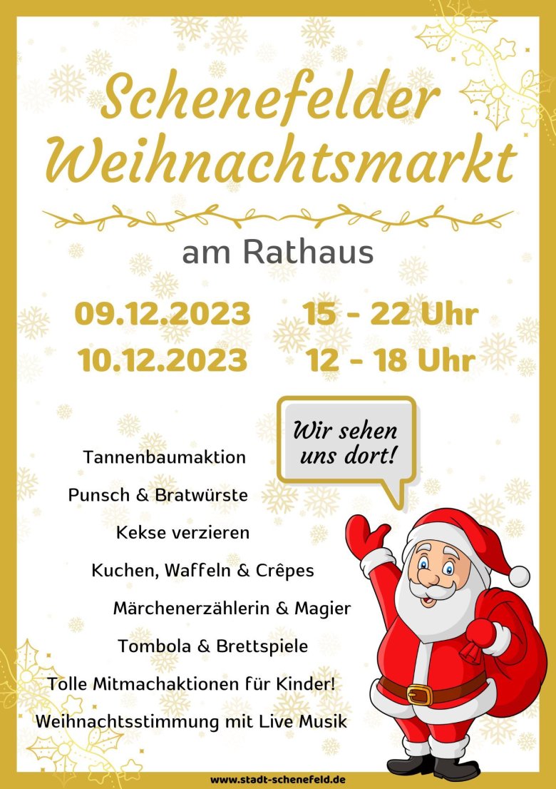 Zu Beginn der Adventszeit wird am 09. Dezember 2023 von 15.00 bis 22.00 Uhr und am 10.12.2023 in der Zeit von 12.00 Uhr bis 18:00 Uhr der alljährliche Weihnachtsmarkt der Stadt Schenefeld auf dem Rathausvorplatz und im Rathausgebäude, Holstenplatz 3-5 in Schenefeld stattfinden. In diesem Jahr unter dem Motto „Typisch Schenefeld – friedlich und freundlich.