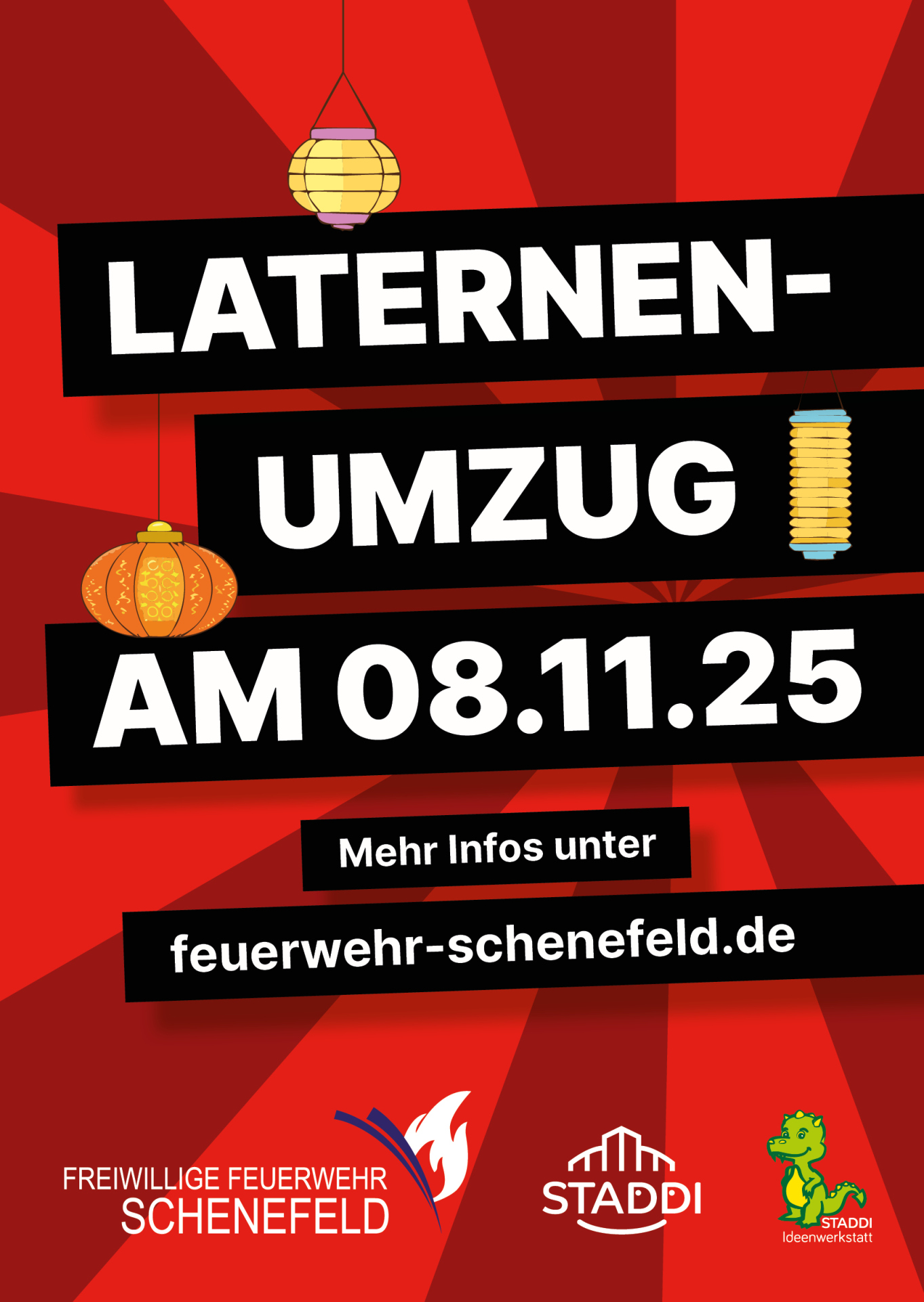 Am Samstag, 8. November 2025 um 18 Uhr ist es wieder soweit und dann findet unser großer Laternenumzug statt. Zu diesem möchten wir alle Kinder und ihre Eltern, Freunde und Bekannten herzlich einladen. Wir werden gemeinsam mit unseren Spielmannszügen einen Sternenlauf durch Schenefeld machen. Die beiden Umzüge starten jeweils an der Grundschule Altgemeinde (Wurmkamp) sowie an der Gorch-Fock-Grundschule (Schulstraße) und enden beide an der Feuerwache im Kiebitzweg 24.