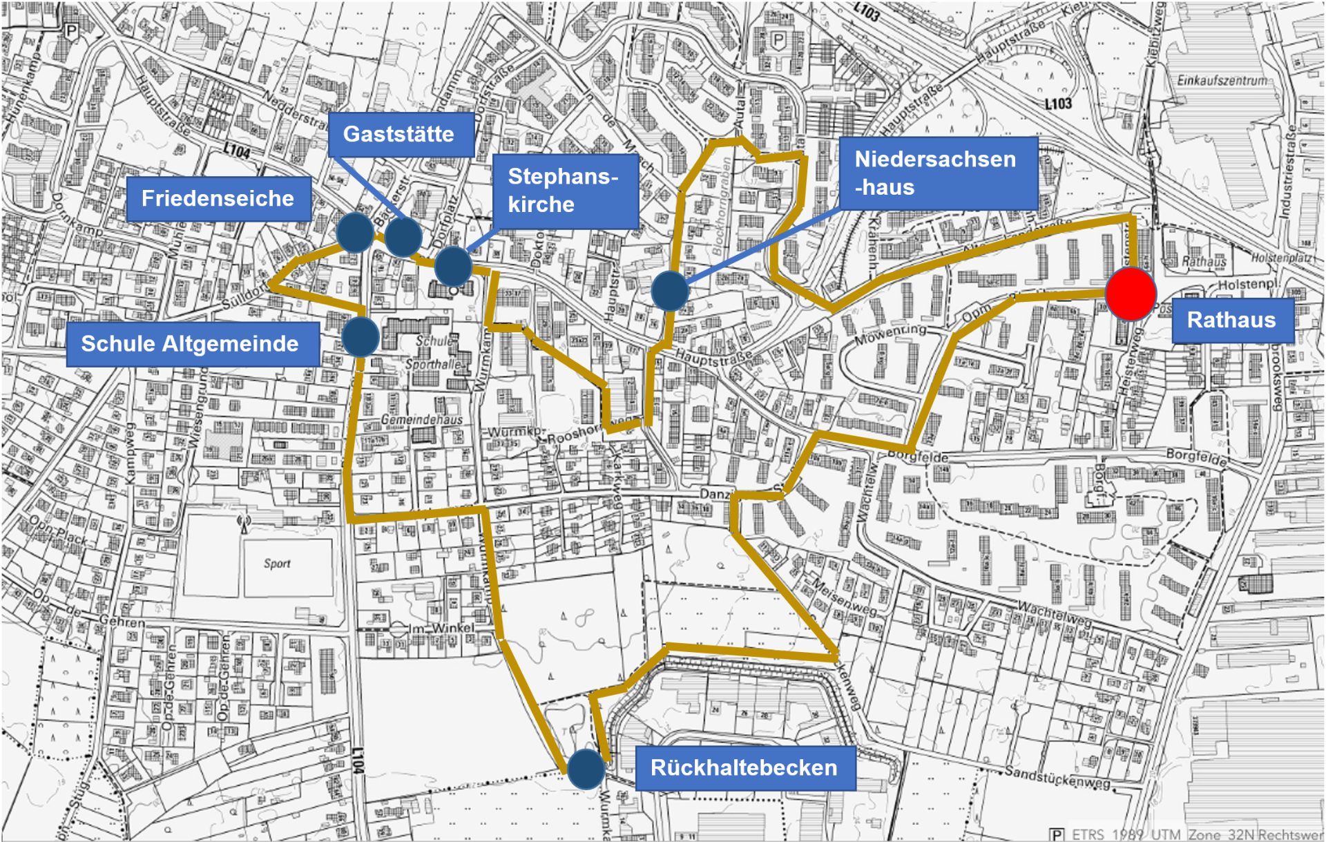 Die Stadtkern-Spazierroute führt vom Rathaus im Stadtkern durch ein Neubaugebiet zu den dörflichen Wurzeln der Stadt. Vom ältesten Schulstandort der Stadt sind es nur wenige hundert Meter ins Grüne mit Ackerbau und Stadtbrachen.